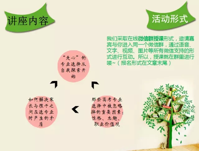 微信公眾號(hào)“向陽(yáng)生涯職業(yè)規(guī)劃”查看歷史記錄,查看最近的一篇文章“選專業(yè),一輩子就這一次!還不走點(diǎn)心!向陽(yáng)微講座報(bào)名ING!”,按文章內(nèi)給到的操作方式進(jìn)行報(bào)名即可。